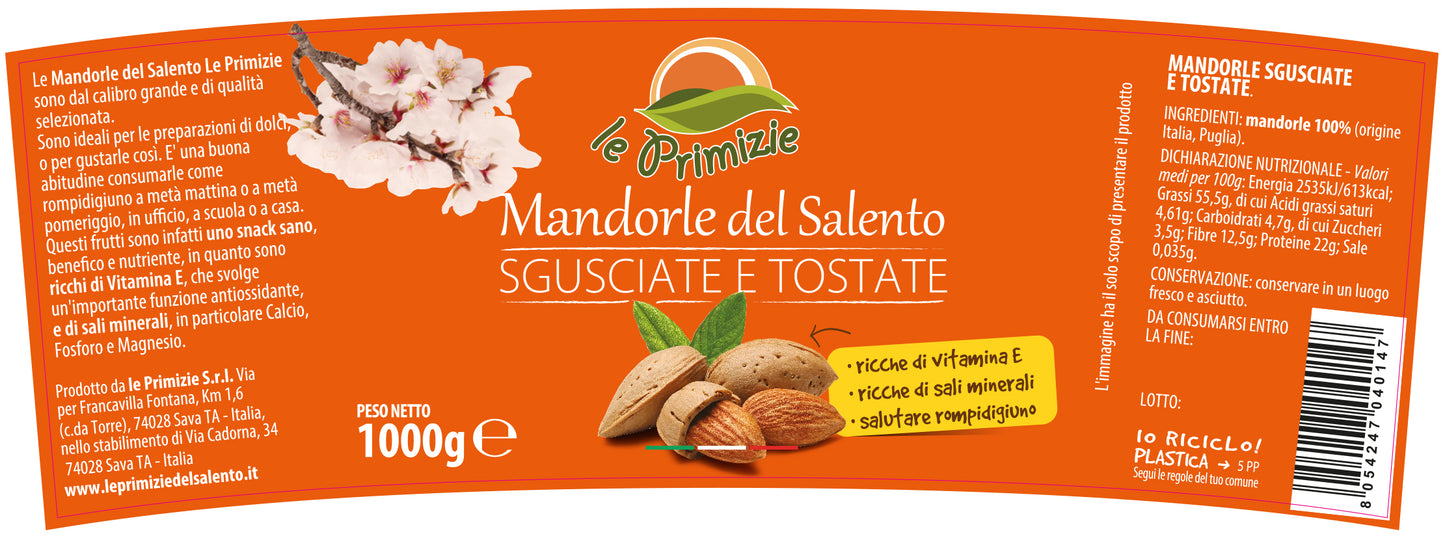 Mandorle tipiche pugliesi essiccate al sole, sgusciate e tostate